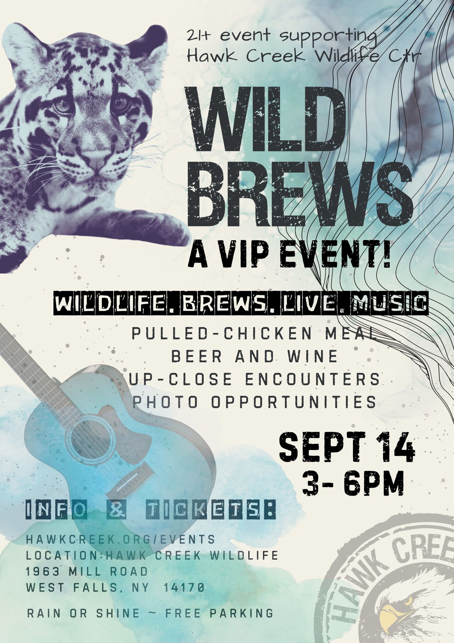 Cheers! Experience the WILD with this one-of-a-kind VIP event. Seasonal beer and wine, food, live music and special animal encounters await you. This exciting evening lets YOU feel like the VIP as you mingle with Hawk Creek’s incredible raptors and other animal inhabitants. This fundraiser will be a night you don’t want to miss! Event is for guests 21+. RAIN OR SHINE.